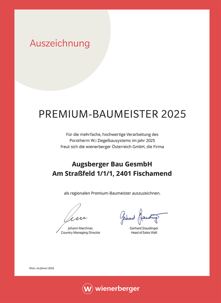 „Es freut uns besonders, dass wir erneut diese herausragende Auszeichnung seitens WIENERBERGER erhalten haben. Die Verwendung des Porotherm-Ziegels ist nicht nur ein Zeichen unserer langjährigen Treue zu diesem Produkt und unserem Lieferanten, sondern in erste Linie ein Qualtitäsbeweis für unsere Kunden“, so Robert Augsberger, Geschäftsführer der Augsberger-Firmengruppe.